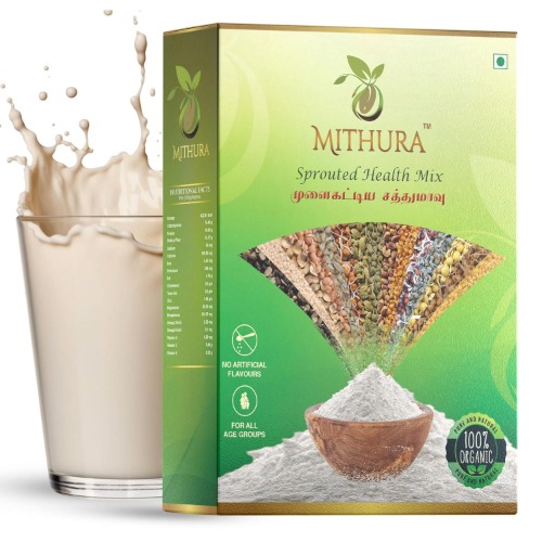Mithura Sprouted Health Mix is a nutritious beverage crafted from 26 natural ingredients, including cereals, pulses, and nuts. Comprising 75% sprouted millets, grains, and pulses, this health mix is suitable for all ages. Each 100g serving contains 16.7g of protein and 14.17g of fiber, supporting a balanced diet. Our mix is free from preservatives, sugar, and milk powders, ensuring a pure and wholesome product. Why choose Mithura Sprouted Health Mix? ◦ Made with first-grade ingredients ◦ Ingredients are pre-washed, sprouted, and roasted for optimal quality and taste ◦ Hand-sieved before packing ◦ Excellent value for your money